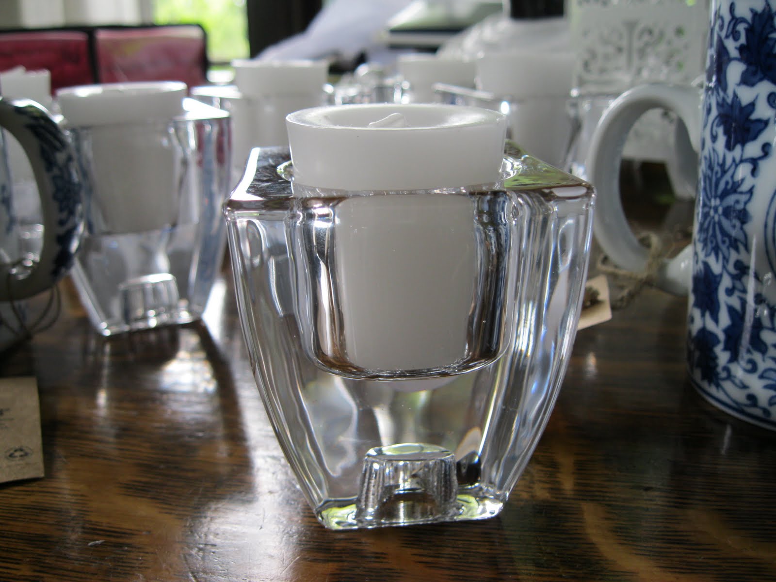 Waterford is sparkling. It’s pretty but very heavy and hard to manage when filled with water. No matter. Today we are putting beauty before function. I found some bamboo stakes at a garden store and I’m thinking the little metal bamboo lanterns will look smashing pinned to the tops of the stakes, especially with candlelight. I love using natural materials in my table arrangements. I typically top off florals with some type of excelsior or fresh fruit or vegetables. I will share my finished table setting after the May 22nd tea.