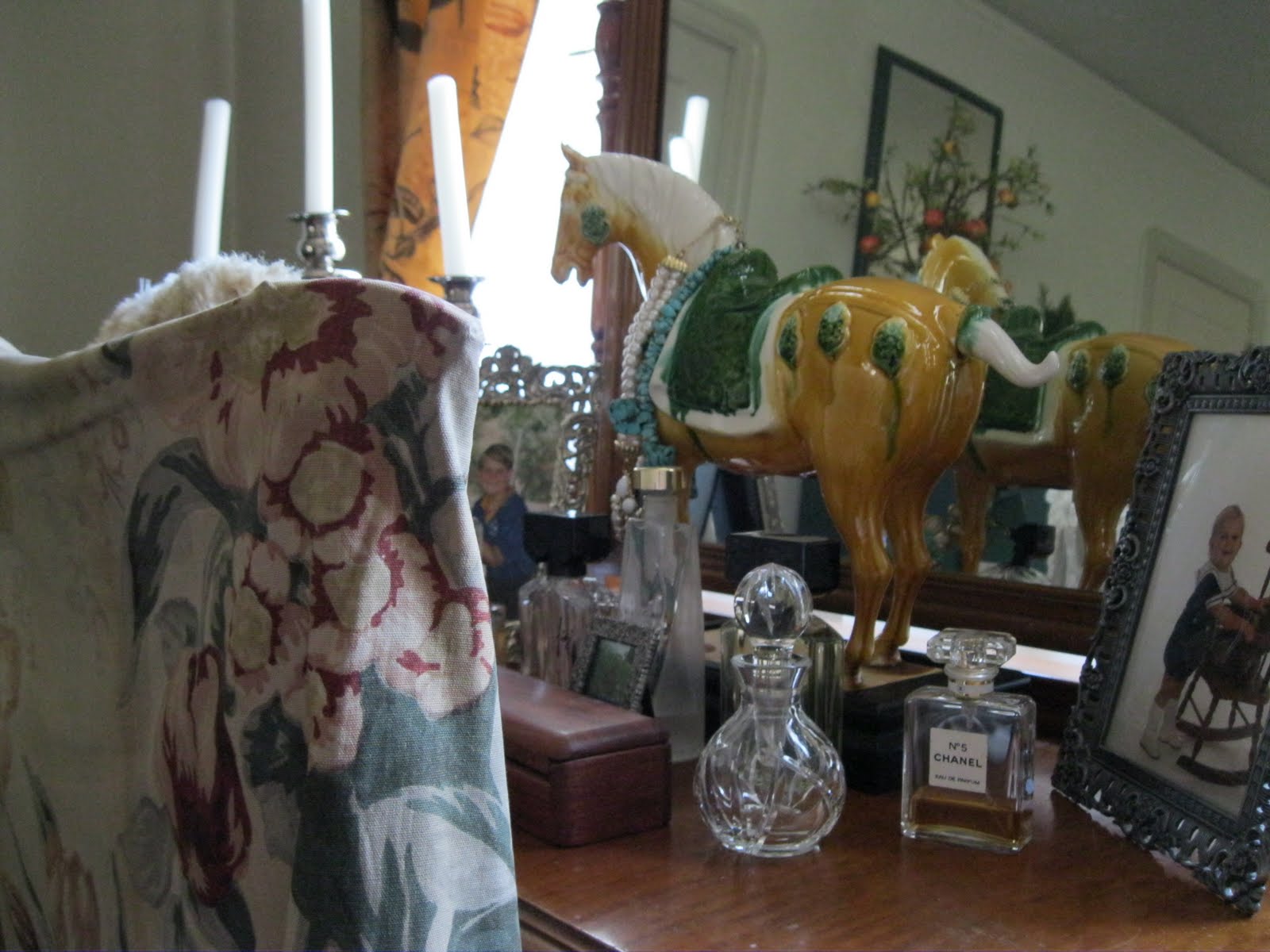 Ralph Lauren’s designs; vintage light fixtures, and an old dressing table.