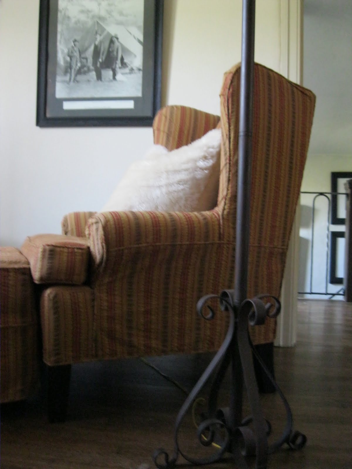 Add another fabric, this time a brown striped slip covered chair and ottoman which picks up the tan color of the vintage fabric. The fluffy white pillow adds a modern element.