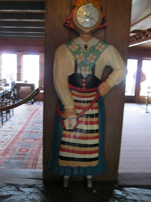 Architectural features include a sod roof, a Scandinavian motif repeated throughout the house, and hanging dragon beams which have been carved and painted. Mrs. Knight chose the furniture to carry out the theme, often having pieces reproduced from antique designs.