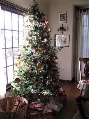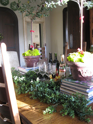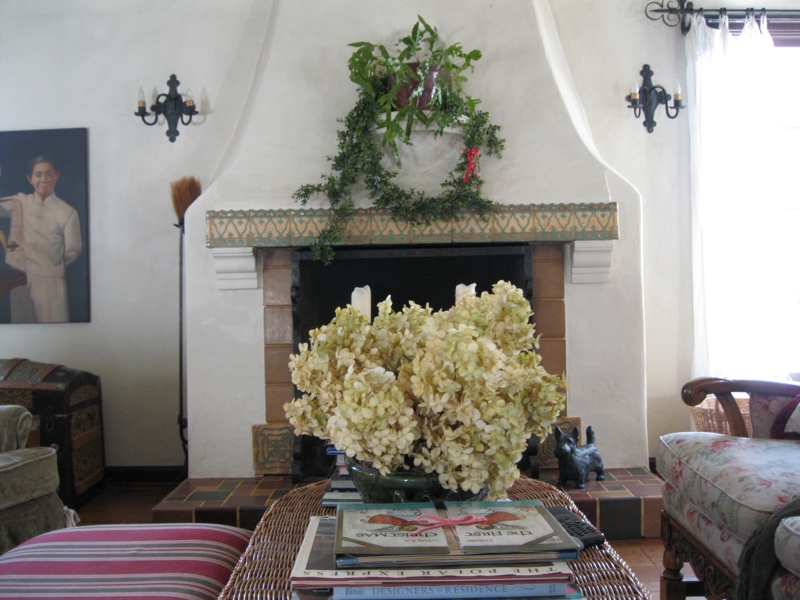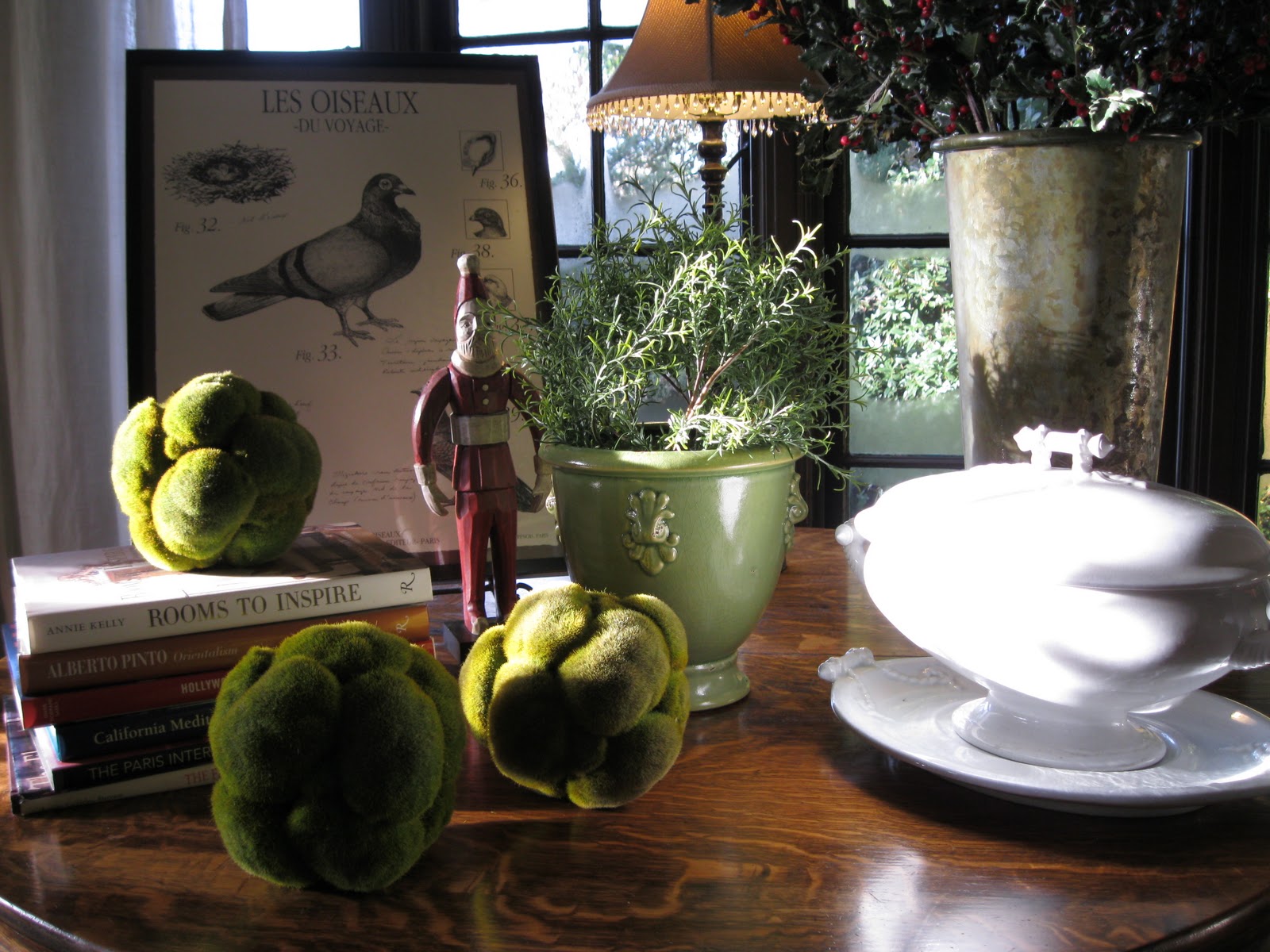 I almost never do Christmas decorating in an organized fashion.  Instead, I simply take a few items out of each room and replace them with lots of greenery, red ribbons, wreaths, faux ornamental fruits and vegetables, and a few Christmas novelties like Christian’s childhood Christmas books, bottle brush trees, and the Santa’s I’ve collected over the years.