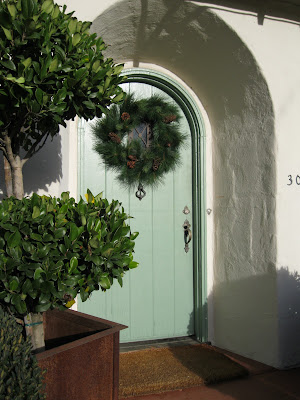 A simple pine bough wreath with pine cones hangs on my arched front door.  The iron framed window has a clubs and spades motif which is repeated throughout the house.