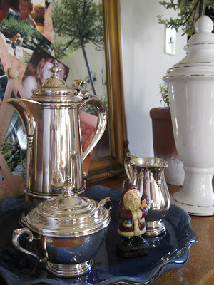 The hand painted, iron Santa looks unassuming next to my wedding silver and platter from a trip to St. Remy Provence, France.