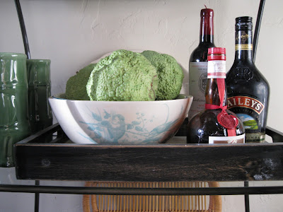 Osage orange in a vintage looking bowl with holiday beverages above.