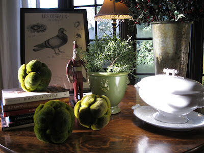 A primitive Santa, a large vase of holly, and my favorite antique stoneware soup tureen looking pretty in the morning light.