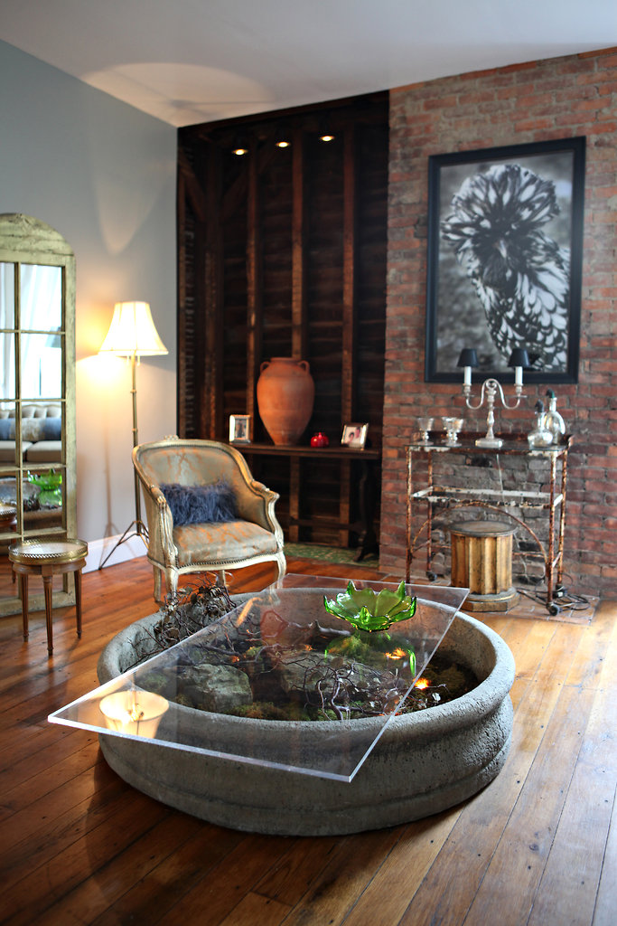 In the living room, a terrarium coffee table made from a cement fountain base and an acrylic sheet. The floor had special reinforcement to accommodate it.