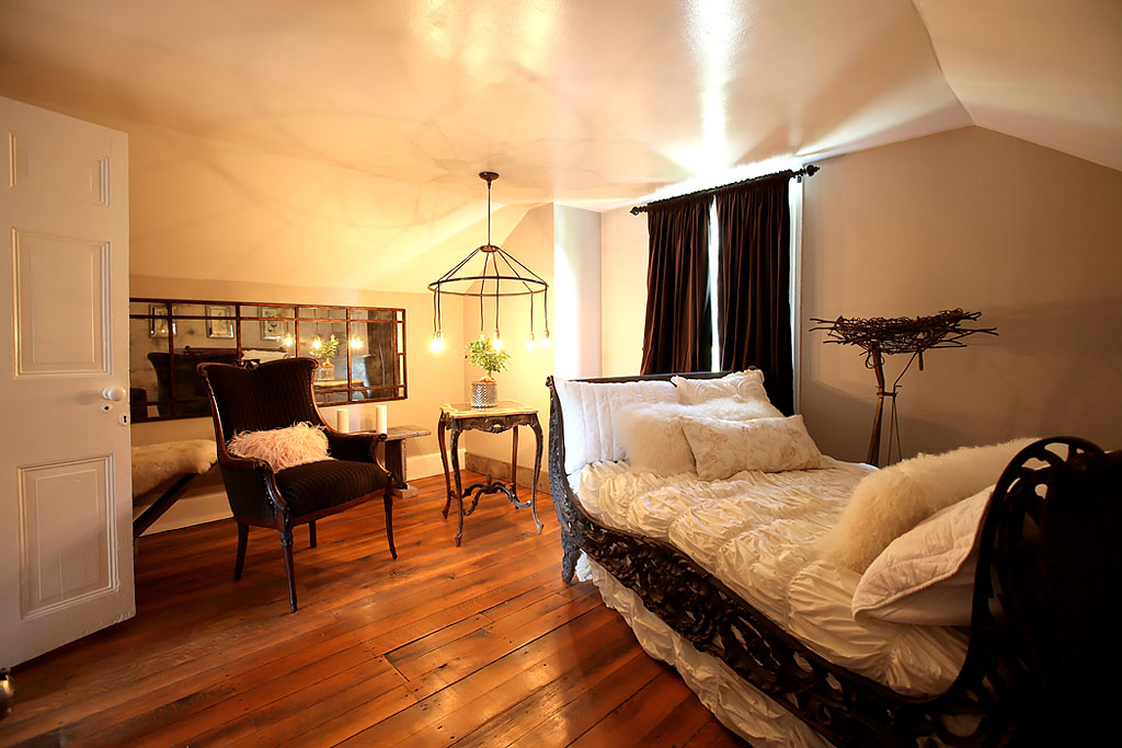Old wood floors, an iron sleigh bed, and another great wire fixture. The mirror fits perfectly under the little eave.