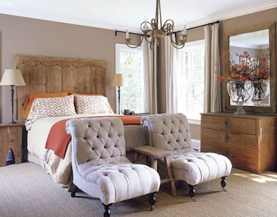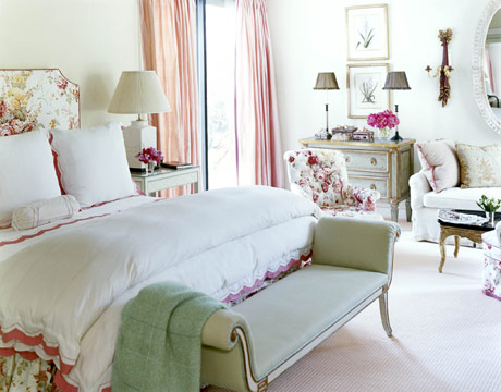 I have always felt that doing bedrooms in red is a big mistake and yet I get requests for them quite often. Bedrooms are meant to be designed with all the restful elements: calming colors, horizontal lines, and contrasts kept to a minimum. The blue toile bedroom is by interior and textile designer Kathryn Ireland.