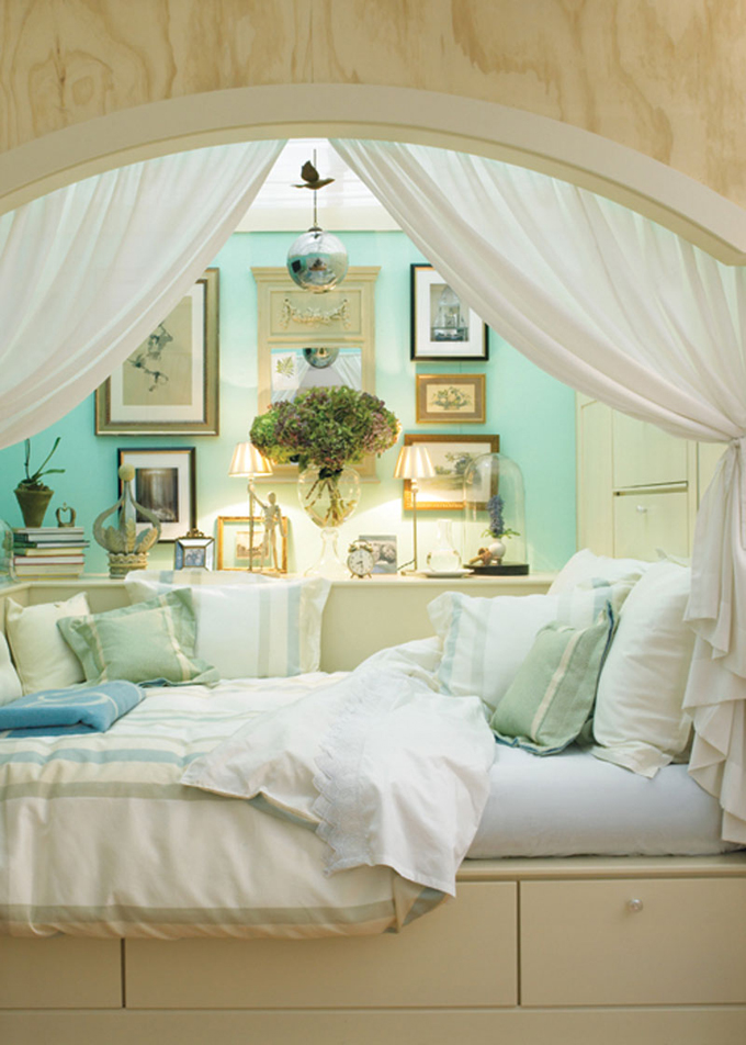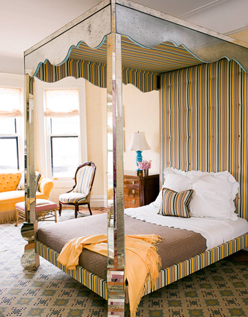 Tester beds create a protected feeling. The fabric muffles sounds from the floors above. When designing bedrooms I like to start with an idea of quiet ambiance, choosing soft fabrics in muted tones of blue, green, and taupe or light and clear ones like pale yellow and peach.