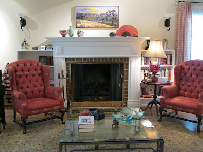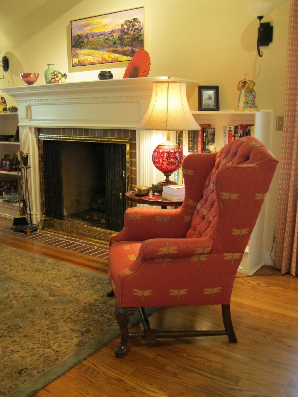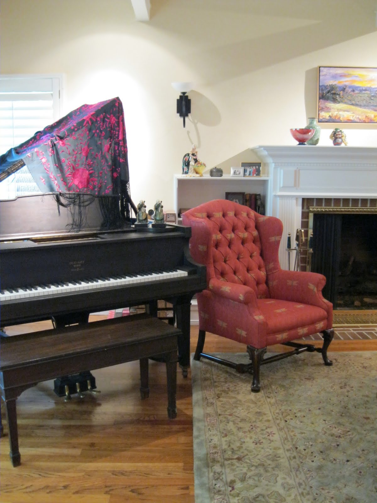 The old baby grand piano has pride of place near the front entry. On it Rita has hung a lovely piano scarf. Oh, and the beautiful pair of tufted wing back chairs were the starting point for our design process.