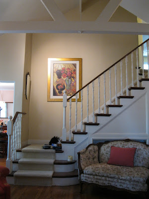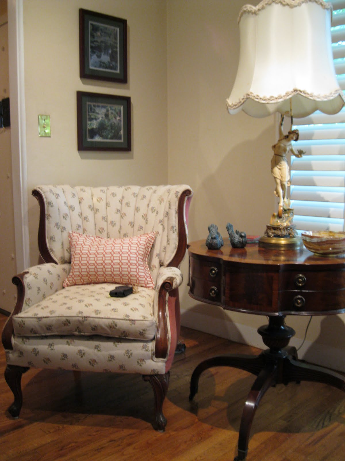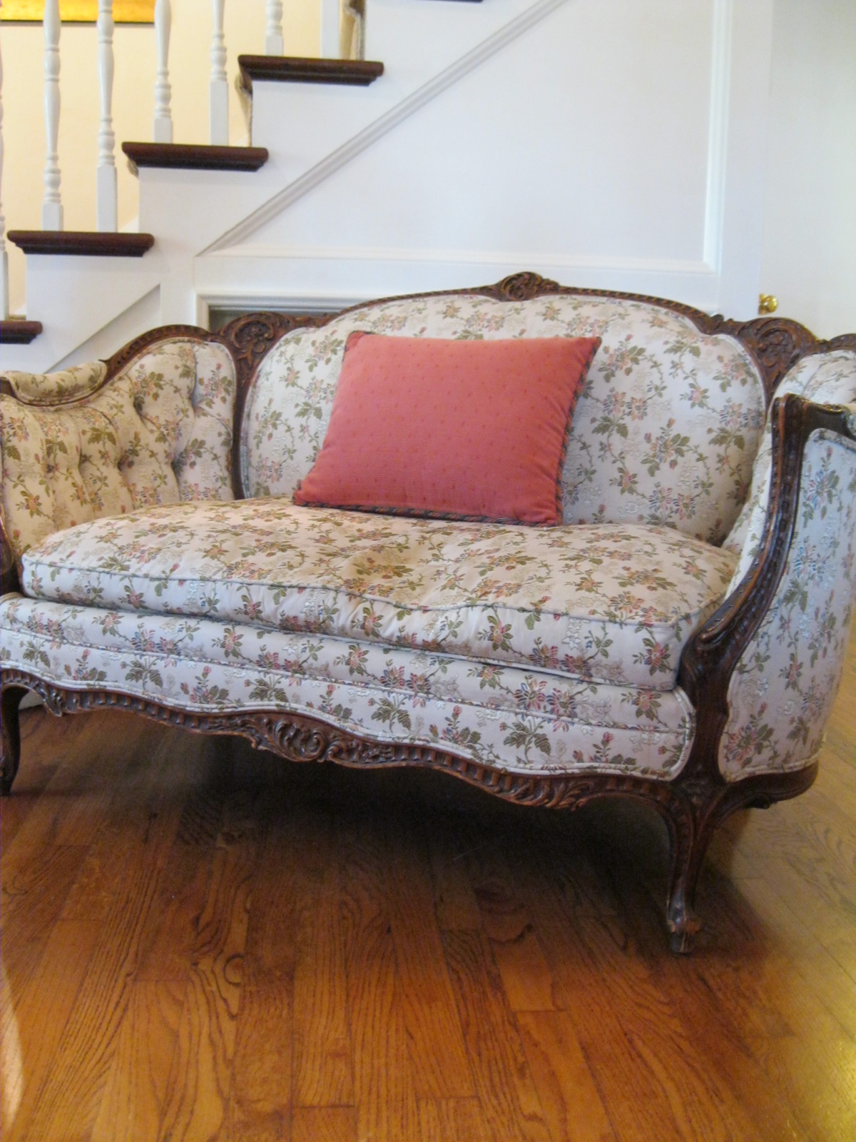The dining room is still a work in progress. It has been painted a lovely light mint green since this shot was taken. Today the chairs are being fitted with their newly covered cushions. New dining room curtains and sheers are in the works as well. More on this room later. Below is a sweet little settee Rita had. We’re ordering a new custom pillow in fabric to match the dining room chairs.
