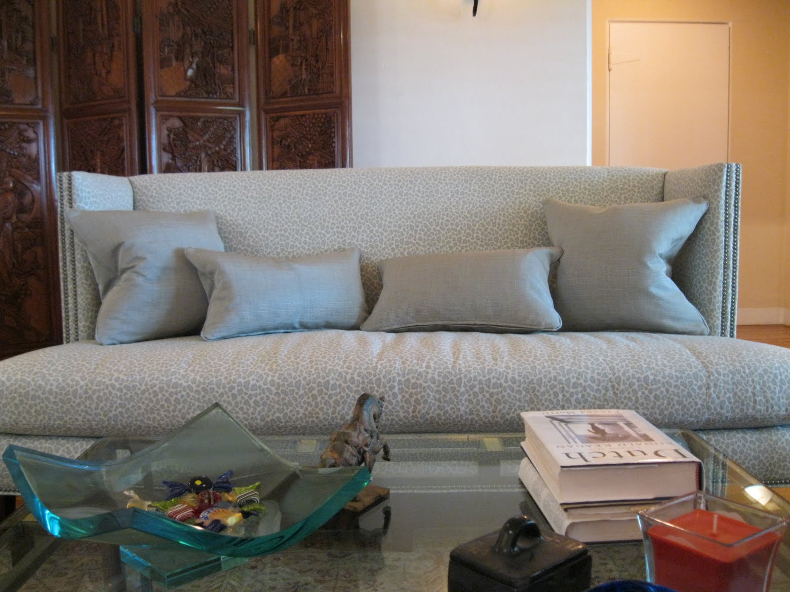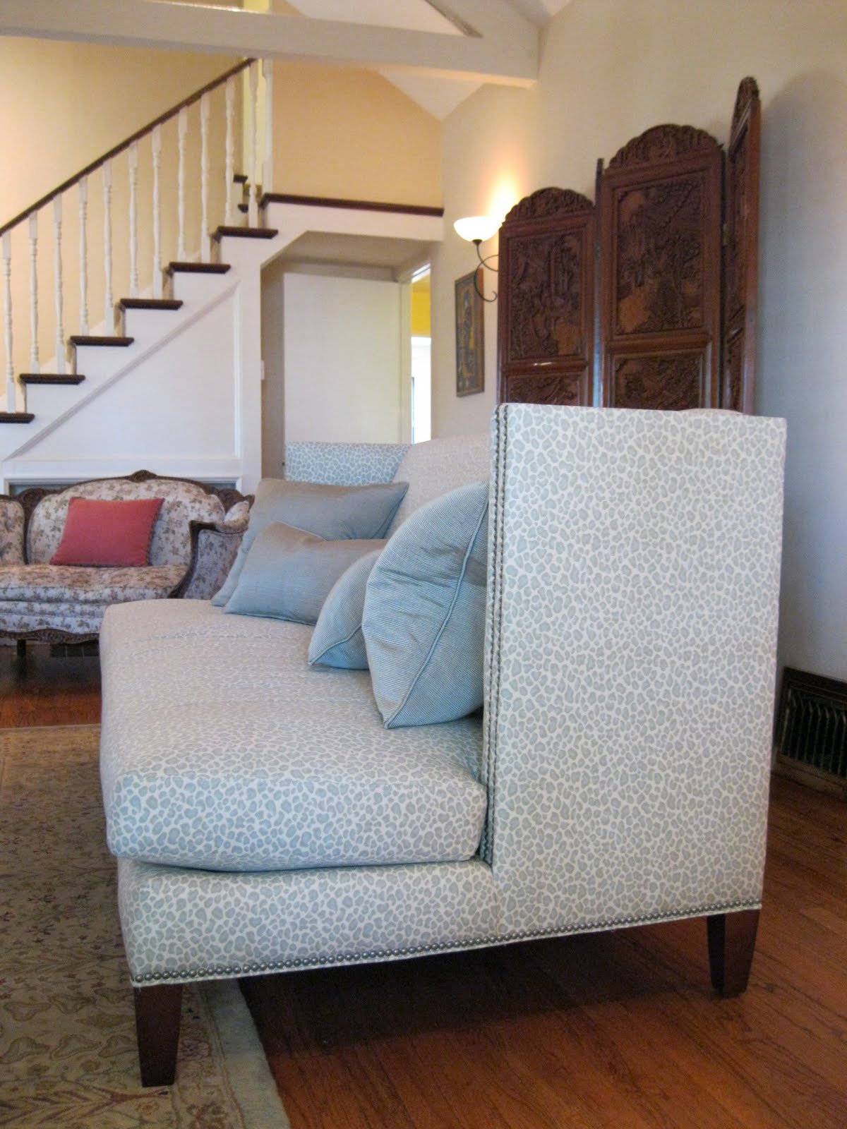 I explained to Rita that since this sofa is going into a formal living room (Rita has a den where she and husband John watch television) it would be okay to have one with a straight back, sans arms. Further, we ordered the cushion upgrade and feather throw pillows. Straight back furniture requires us to sit up straight and when we sit straight, we naturally look better.