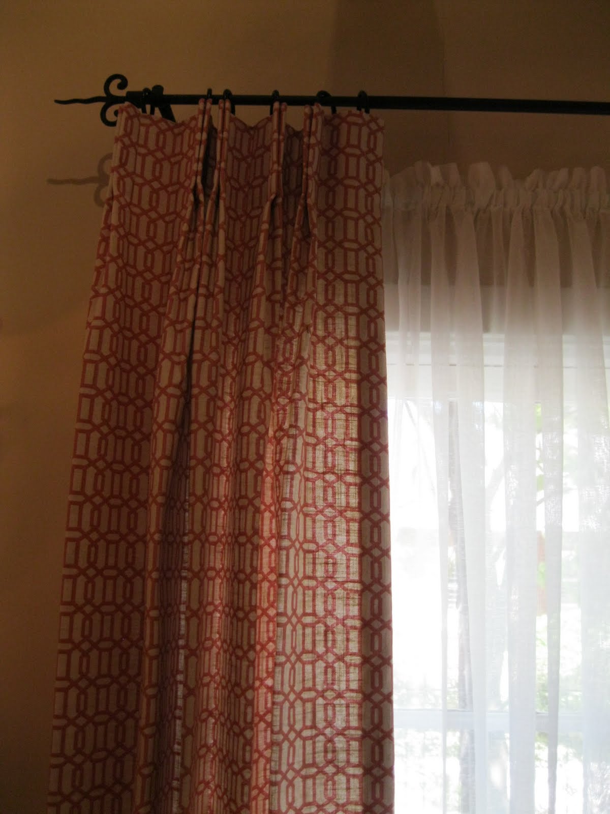 Using the existing curtain rod, we designed a window treatment of sheers and stationery panels in this great Kravet geometric print linen called Joshua. It has a cream background with a brick or “faded red” design. It looks incredibly soft next to the sofa and pale, butter colored walls.