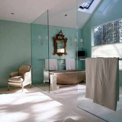 “Dress up a cozier water closet with a wall of antique mirrors in different shapes and sizes for striking bathroom design- perched on several shelves, they act like lighting fixtures when reflecting the adjacent outdoor sunshine. Wall of mirrors via Martha Stewart.”
