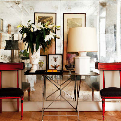 Make a big statement the moment guests enter your home with a wall of antique mirrors. Some additional interior design ideas include a few vintage red chairs, a stylish table lamp and an urn overflowing with fresh blooms. Flashy entryway (image above) via Eclectic Revisited.”
