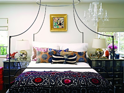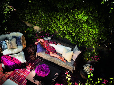 Another design element I currently love is detail and lots of it. Jacqui Getty’s veranda is a good example of this. A great day bed, handmade area rugs, throws, nubby pillows, Thai tables and of course plenty of greenery make a great outdoor space. I am inspired by this space with it’s purples, indigo’s, fuscia’s, blacks, whites, and greens.