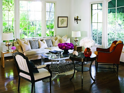 Gleaming hardwood floors, zebra print rugs, and warm white linen sofas are a winning combination. Unadorned windows are a bold step in sunny southern California. Perhaps a bit impractical but the look is to die for.