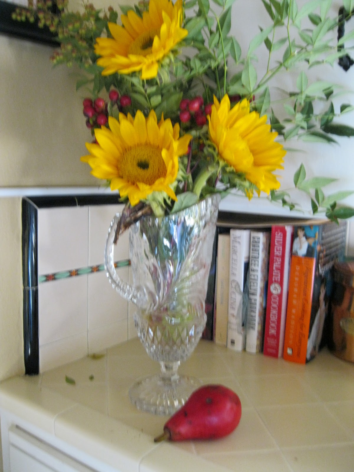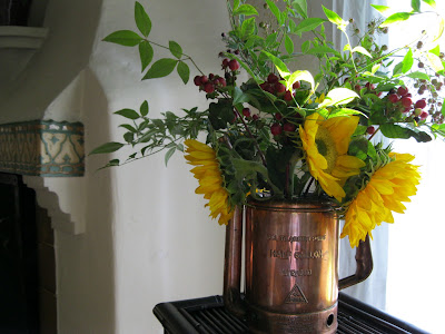 Late sunflowers mix beautifully with fall foliage too, especially if the vessel holding the arrangement has some autumn elements. This is an old copper oil can and the spout has a hinge that extends fully for ease of pouring.