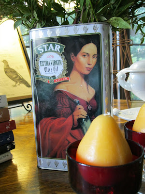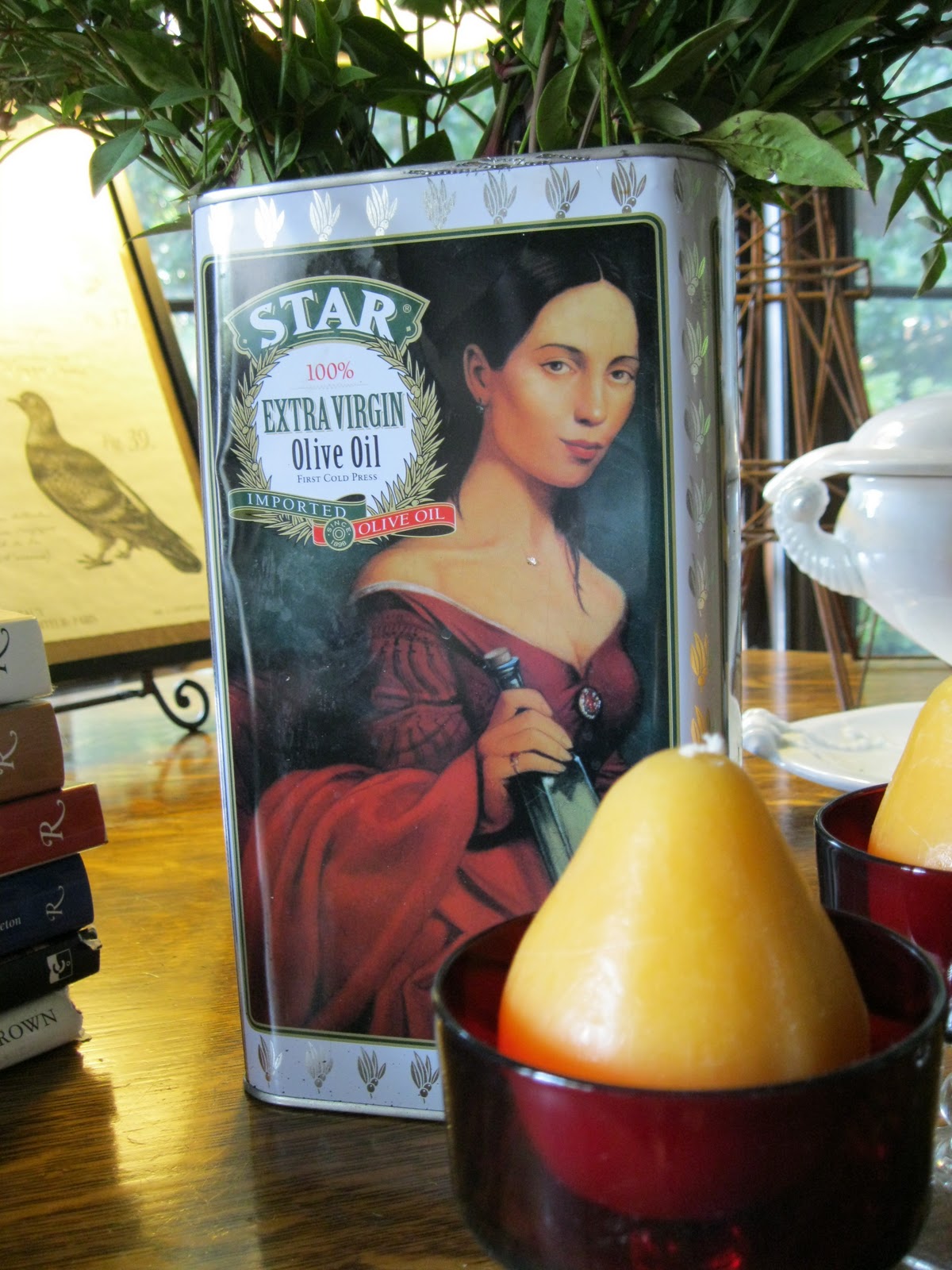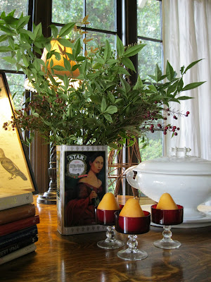 I love the way these olive oil cans relate to my vintage cranberry dessert dishes and tangerine hued, pear shaped candles. I saved a dozen or so and keep them on hand for various design projects.
