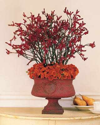 For intermediate to advanced floral designers, stems purchased at the flower market make the most beautiful home made centerpieces. Since so few florists do trendy styles like the display above, it is good to learn to do your own, particularly for the holidays. This arrangement has kangaroo paws in a bed of small but colorful mums.