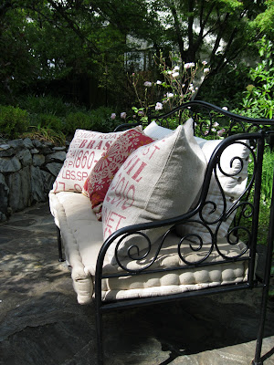 The small pink roses behind the iron daybed were from last summer. I think they are called cupcake roses. They have such a nice fragrance.