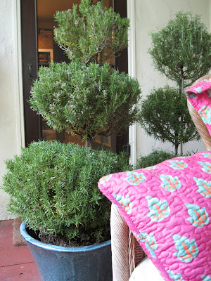 The Thursday before Mother’s Day my specially ordered gift to myself arrived: a box of five 41 inch tall triple ball rosemary topiary. I spent the latter part the next day planting them and the next three days watering and enjoying the whole effect.