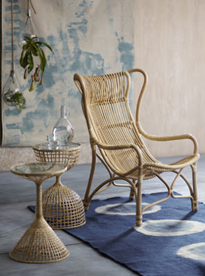 The coordinating tye-dye pillows and fab wicker chair create a soft and laid back feel. The faded blue denim color is positively yummy. I would love this classic chair anywhere from living room to nursery. I can see it with a retro couch and oversize burl coffee table. Completely fab.