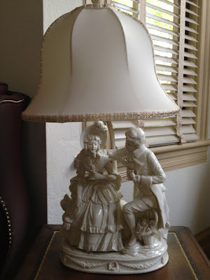 I had a beautiful sofa to work with, a large framed mirror, some interesting religious artwork, and various end tables and lamps. I found this lamp in a spare bedroom in one residence we were picking from. I wondered if it was Meissen but I’m not an expert on ceramics.