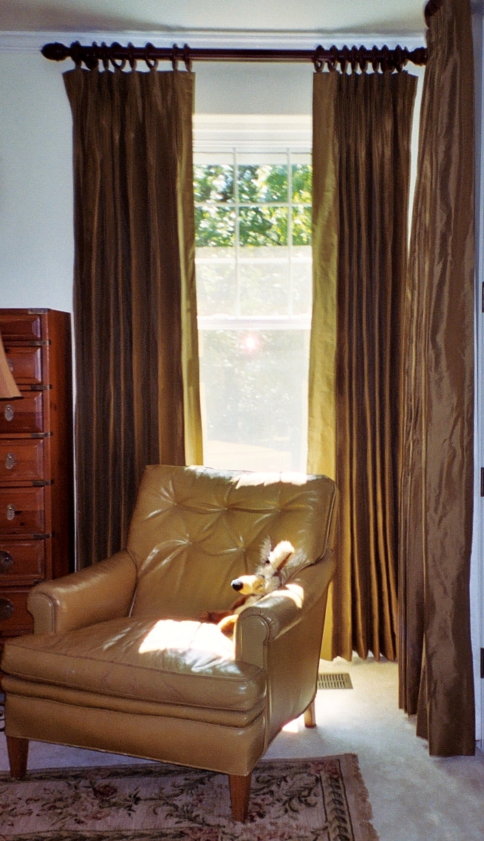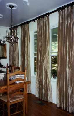 All pinch pleated draperies and box pleated valances were done in silk ticking on custom iron rods and rings. They were absolutely exquisitie. We ordered over 100 yards of silk in subtle, neutral shades of caramel and taupe.