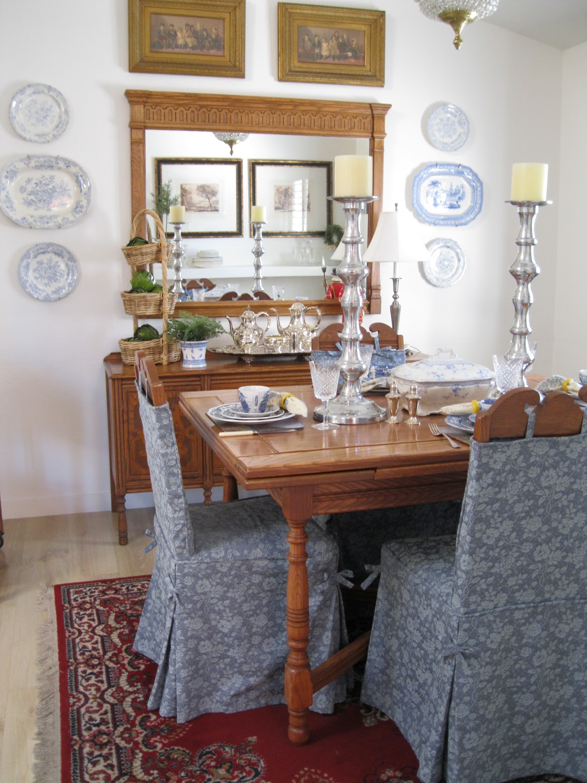 Most of the furnishings moved over beautifully without much change. All we did was alter the draperies and recover two arm chairs. The little dining area is open to the entry and there are blue drapery panels to match the slipcovers.