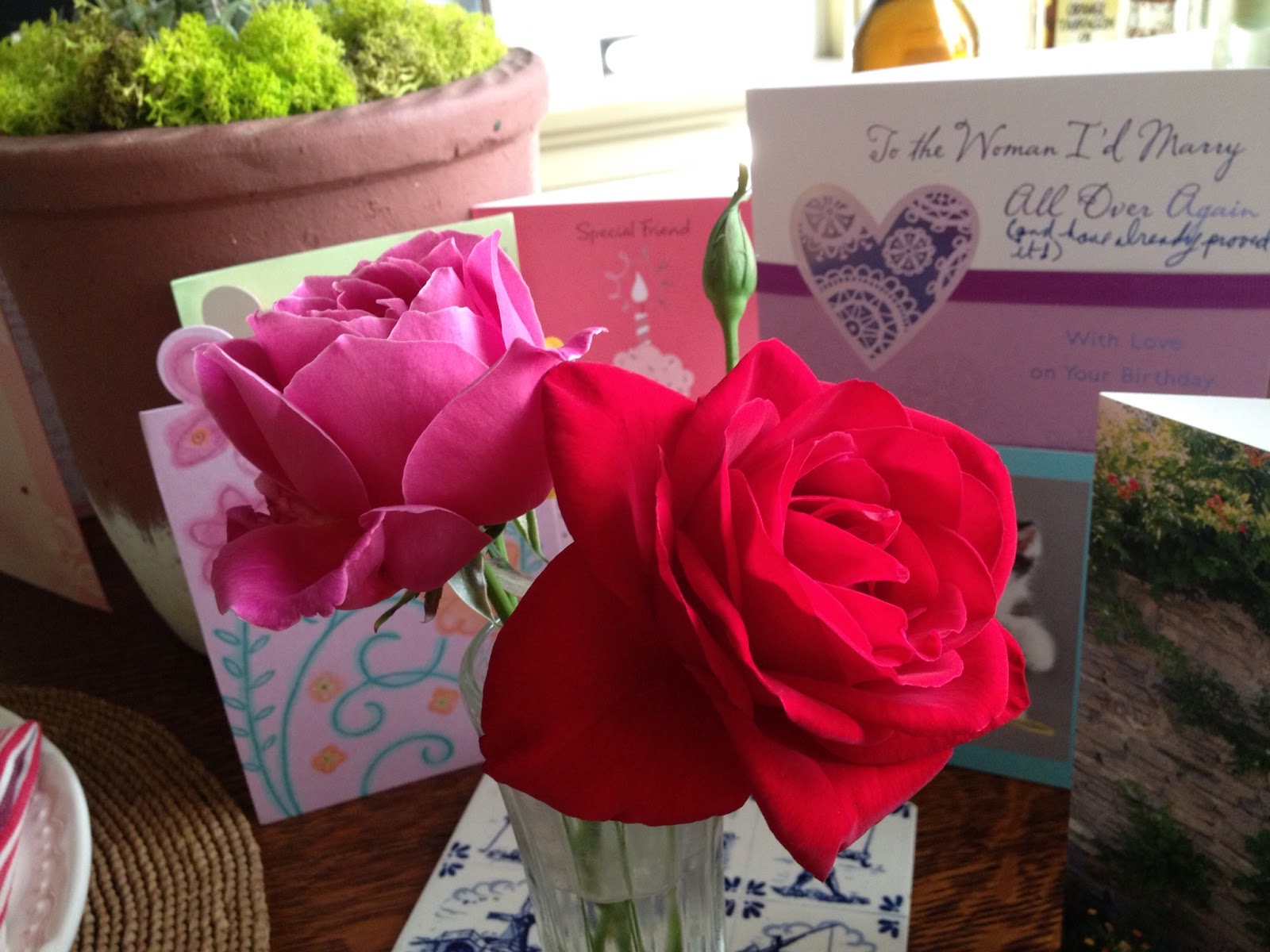 Decorating for Valentine’s Day is easy if you have a few red accessories. In small quantities, red actually works very well with a number of different color schemes. It’s especially beautiful with green, blue, black, and gray. Above, it looks smashing against my mercury lamp, mercury jar and pink, red, and white roses.