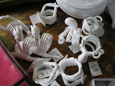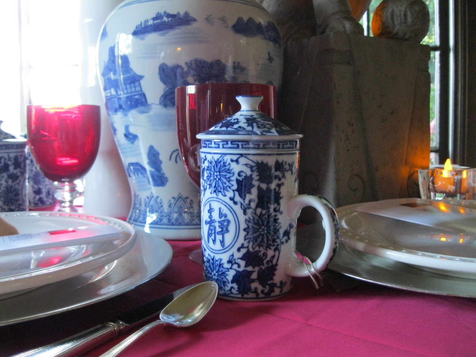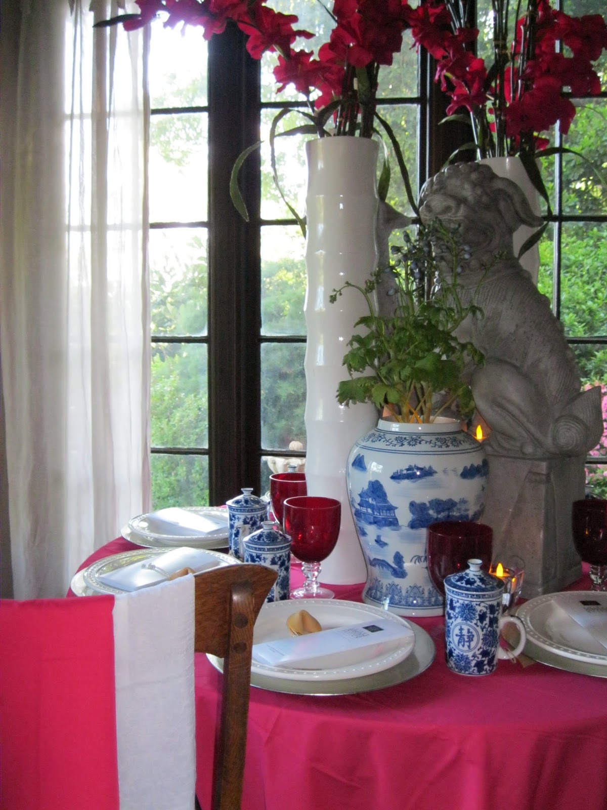 The color combination blue, white and magenta makes a strong statement. I had my seamstress take these great magenta bed sheets and make a custom fitted round table cloth and eight matching napkins. The blue and white vase ended up in my master bedroom and the red goblets, the dining room.