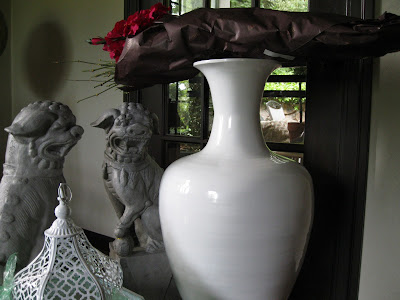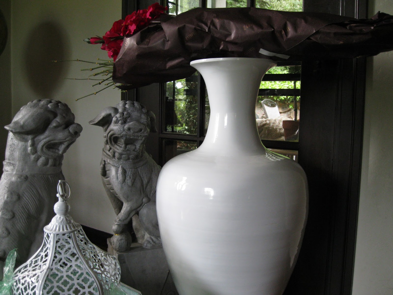 Giant, light weight Foo dogs and white lacquered bamboo vase.