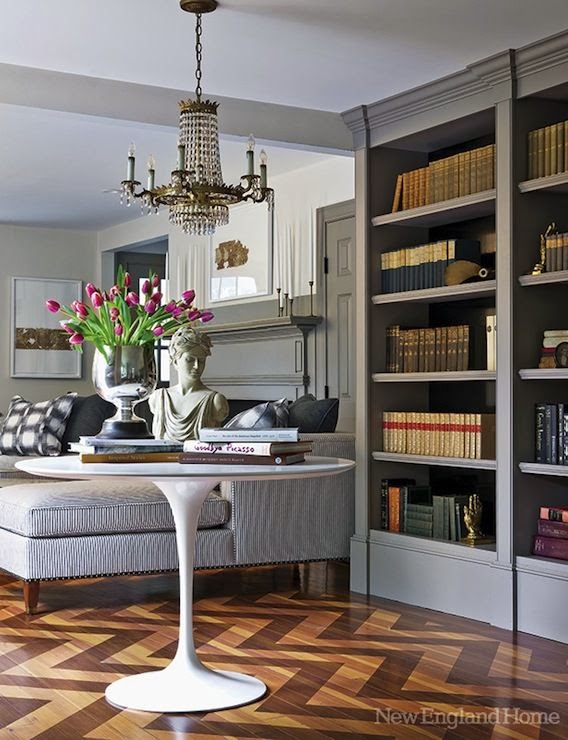 Cool gray painted book cases and paneling, chevron stained floors and an Aero Saarinen table: a fresh take on classic design.