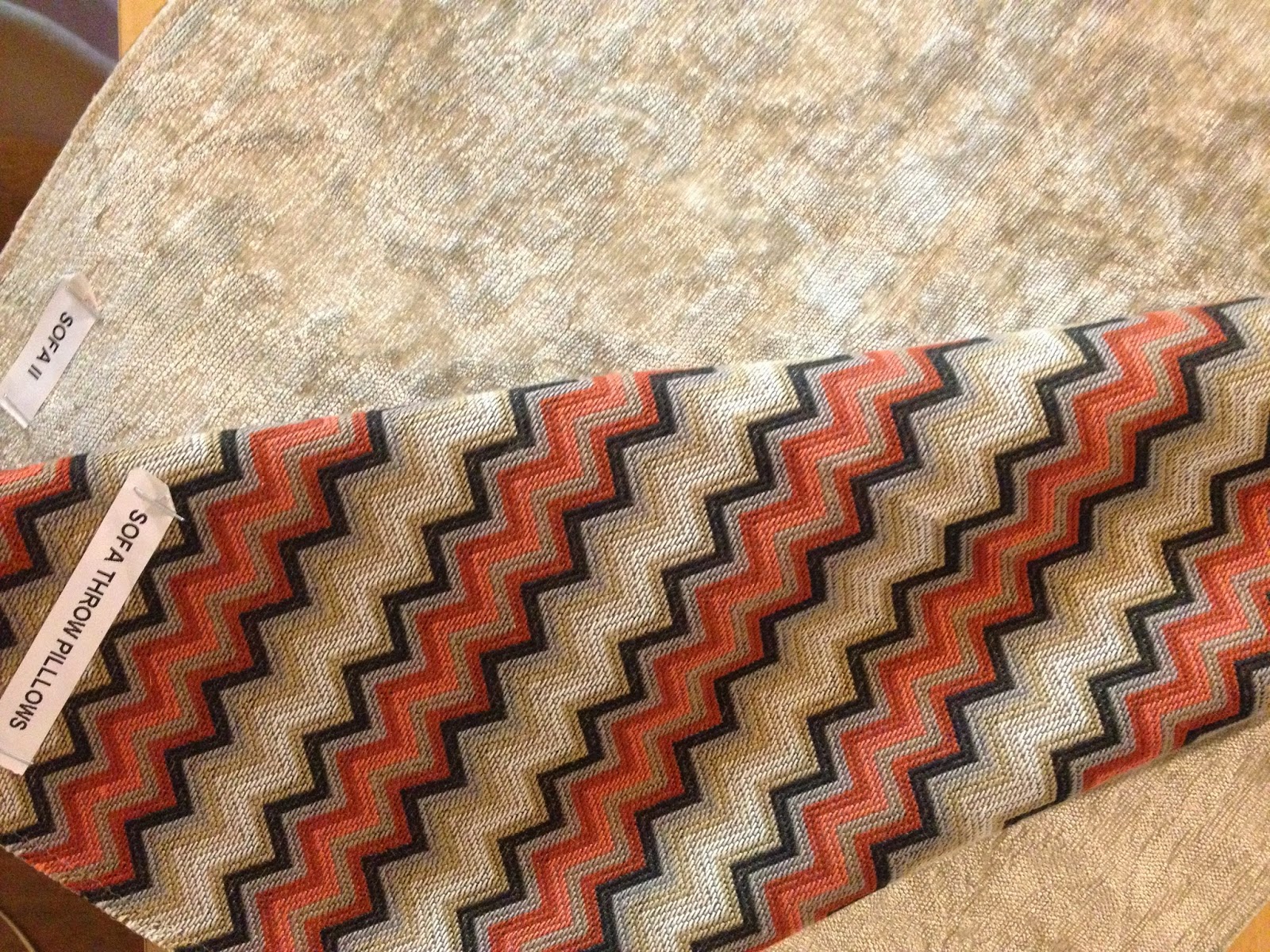The main fabric will be the silvery gray silk velvet above. It will have a back of five twenty four inch pillows: three in the taupe velvet with a contrasting zigzag welt, and two in the zigzag fabric with a Terra Cotta colored, brushed fringe.